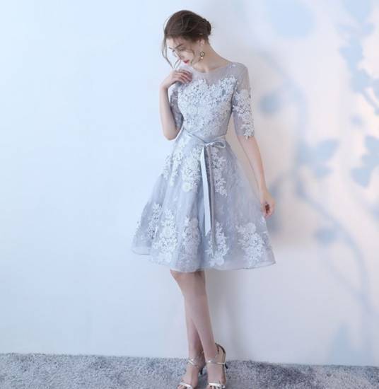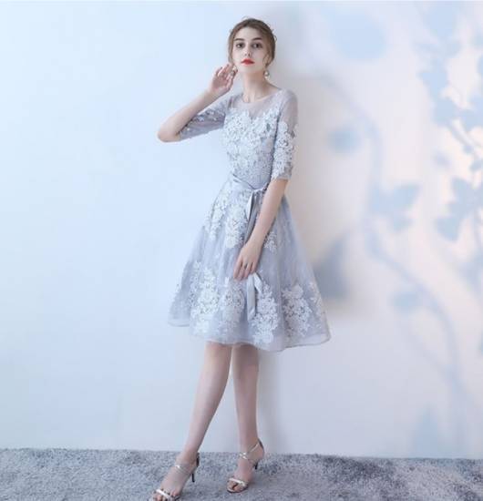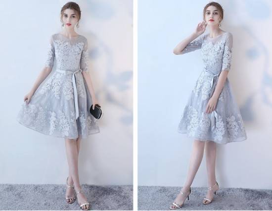 パーティードレス ワンピース レース 刺繍 五分袖 ショート丈 ミッドウエスト ラウンドネック シースルー 二次会 お呼ばれ 結婚式 パーティ