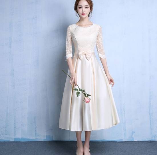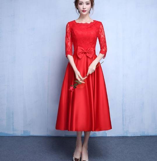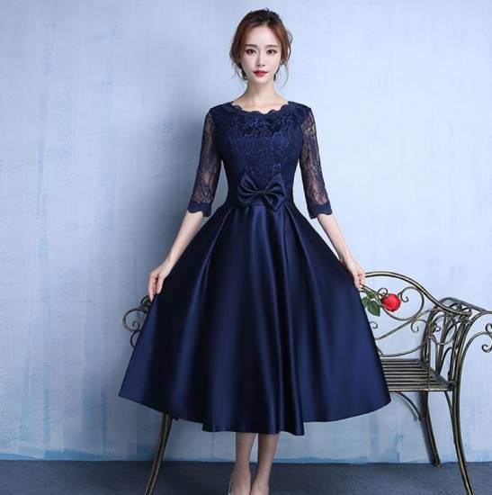 パーティードレス ワンピース レース 七分袖 ミディ丈 ハイウエストリボン ラウンドネック シースルー 二次会 お呼ばれ 結婚式 パーティ