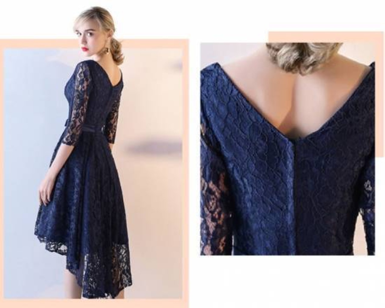パーティードレス ワンピース レース 刺繍 七分袖 ショートスカート フィッシュテール ミッドウエスト Vネック シースルー 二次会 お呼ばれ 結婚式 パーティ