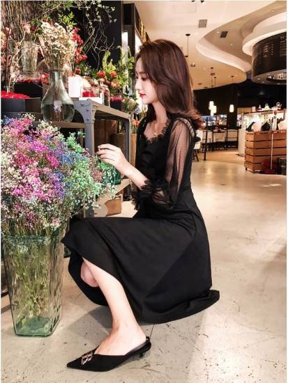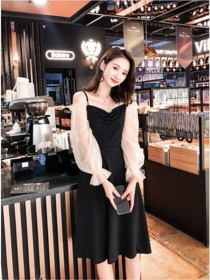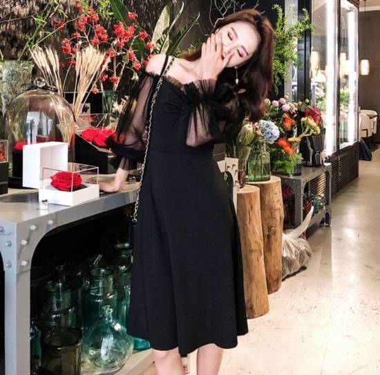 パーティードレス ワンピース メッシュ 長袖 ランタンスリーブ ミッドスカート ミドルウエスト オフショル シースルー 二次会 お呼ばれ 結婚式 パーティ