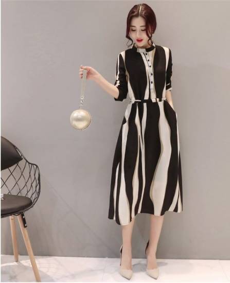 パーティードレス ストライプ ワンピース 七分袖 ロングスカート ハイウエスト スタンドカラー 二次会 お呼ばれ 結婚式 パーティ