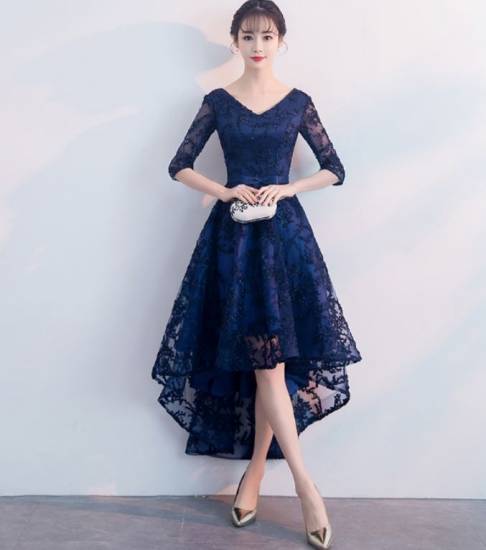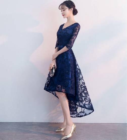 パーティードレス ワンピース レース 刺繍 七分袖 ショート丈 ミッドウエスト Vネック シースルー 二次会 お呼ばれ 結婚式 パーティ