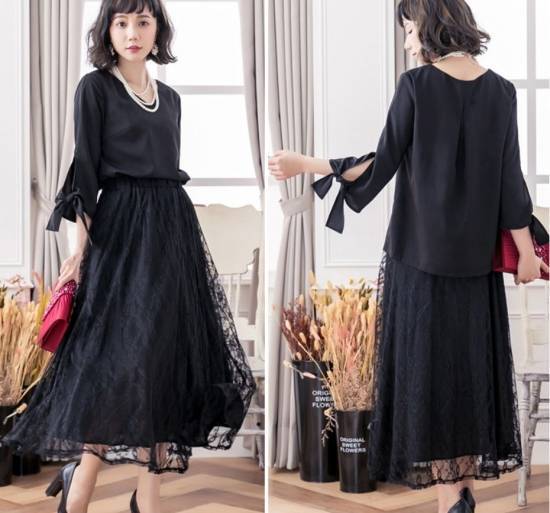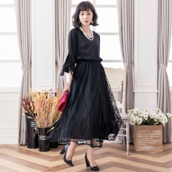コンパクトなトップスと大きくスイングするフレアロングスカート