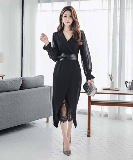 レースの裾とシースルーの袖がおしゃれなスリムフィットのドレスです。