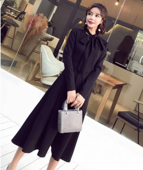 パーティードレス ワンピース 長袖 ミディ丈 ハイウエスト ラウンドネック 二次会 お呼ばれ 結婚式 パーティ
