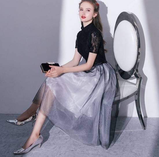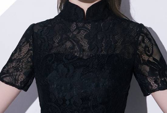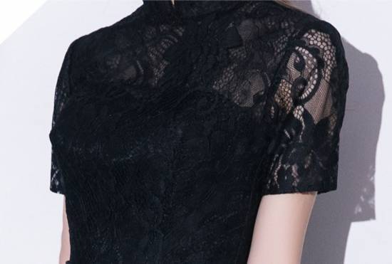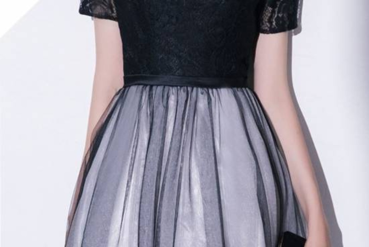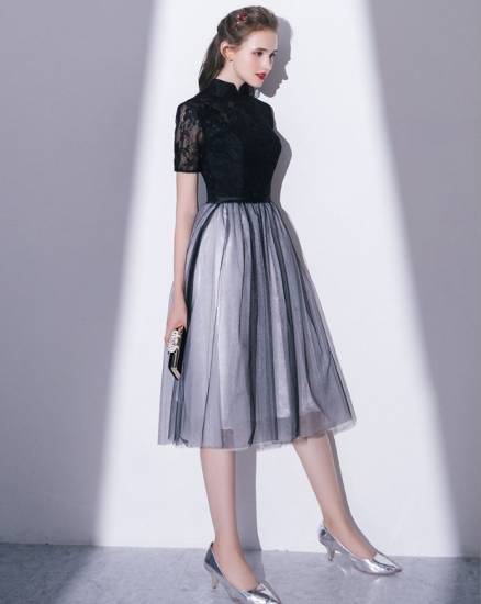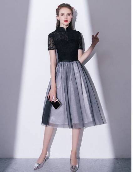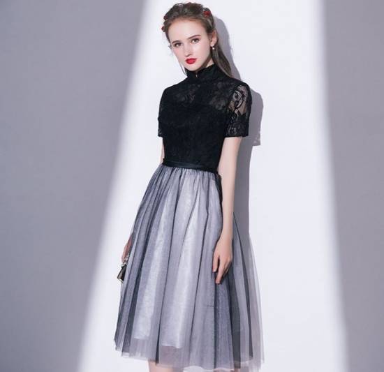 【一部即納】パーティードレス ワンピース レース 半袖 ミディ丈 ミッドウエスト スタンドカラー シースルー 二次会 お呼ばれ 結婚式 パーティ