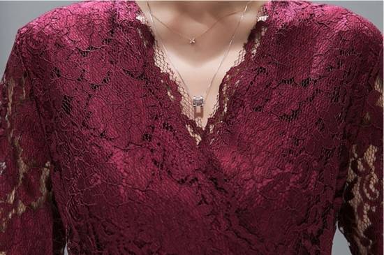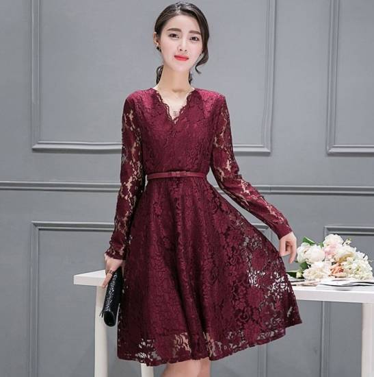 パーティードレス ワンピース レース 刺繍 長袖 ミディ丈 ハイウエスト Vネック シースルー 二次会 お呼ばれ 結婚式 パーティ