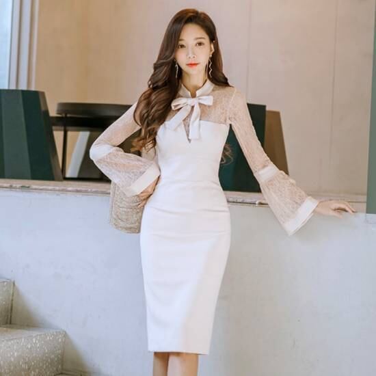 ホワイトレース リボンネック ベルスリーブタイトワンピース
