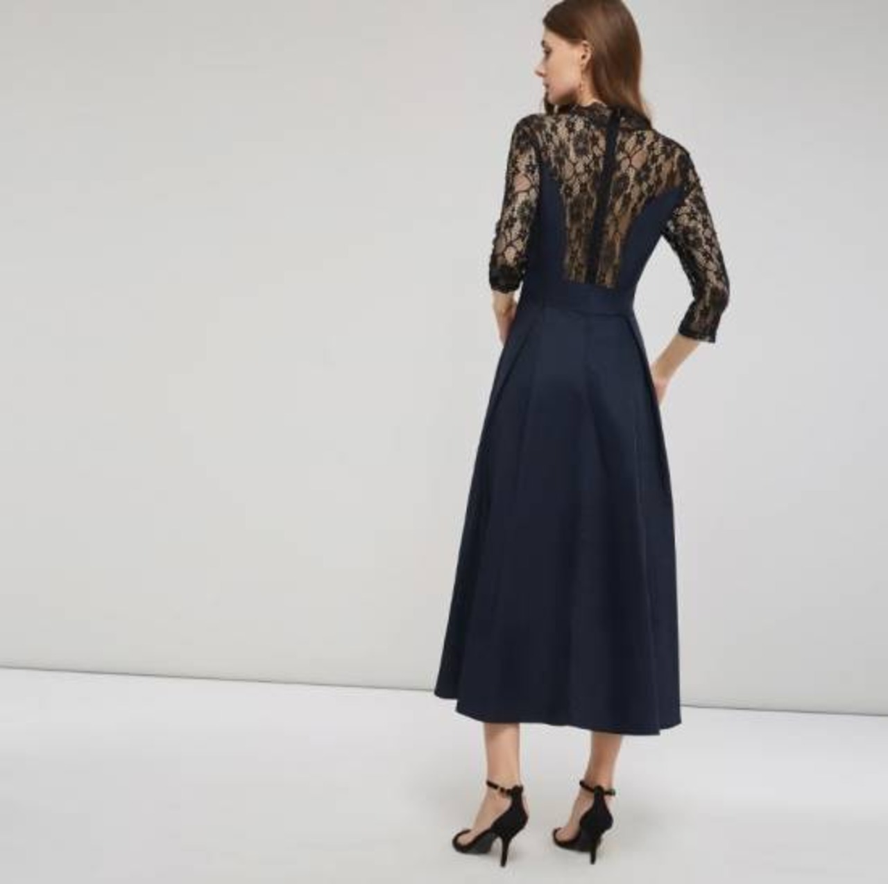 全体がシックで落ち着きのあるネイビー、軽やかなAラインのフレアスカートは、清楚で上品に女性らしく、エレガントに大人可愛くおしゃれに決まります。