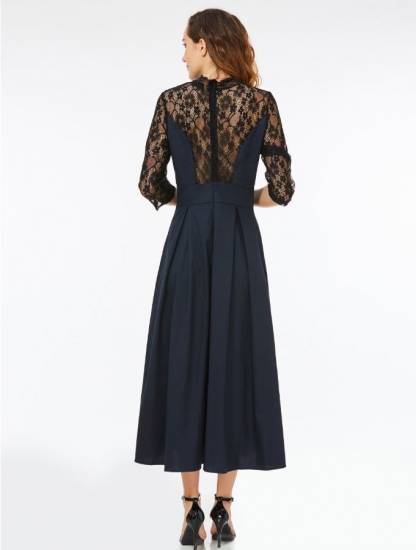 パーティードレス ワンピース レース 刺繍 七分袖 ロング丈 ミドルウエスト ラウンドネック シースルー 二次会 お呼ばれ 結婚式 パーティ