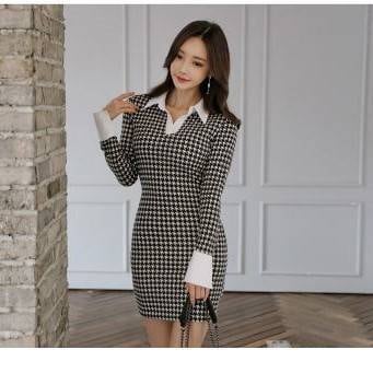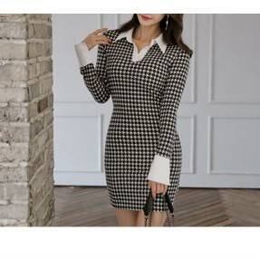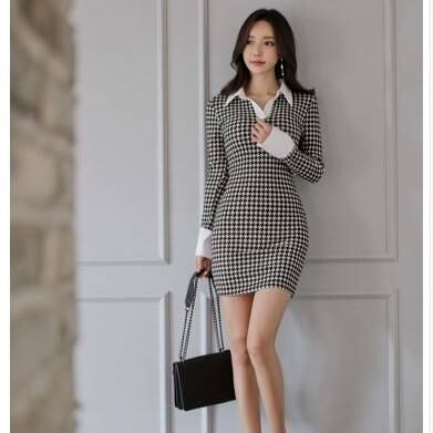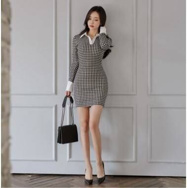 千鳥格子のポロ襟がフェミニンで上品。さらにタイトなラインがセクシーなセミフォーマルなワンピース。