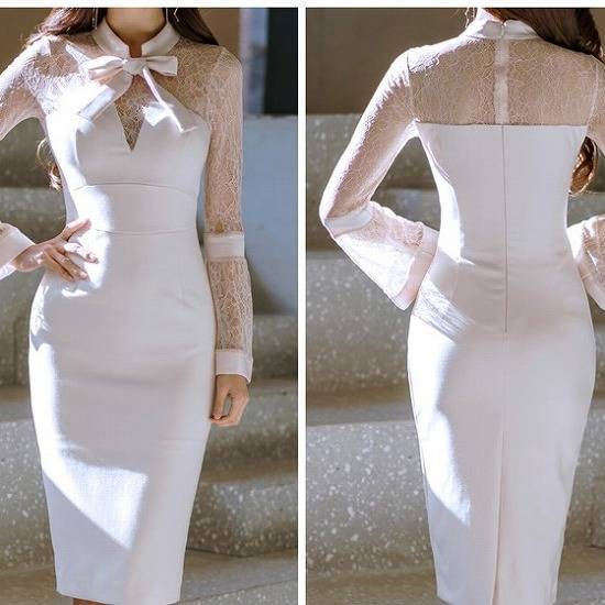 すっきりと伸びたトランペットスリーブとスカート丈が縦長の美しいシルエットの上品ワンピ。
