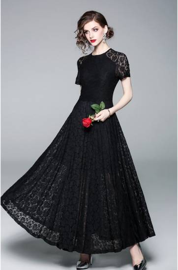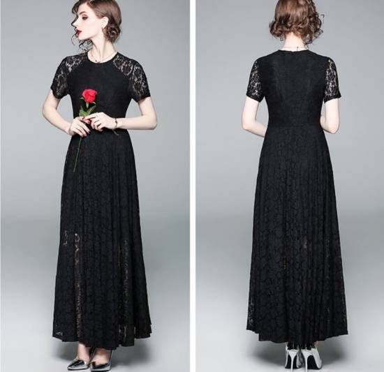 重くなりがちな黒のロングワンピを脚の透け感と半袖で軽く仕上げました。