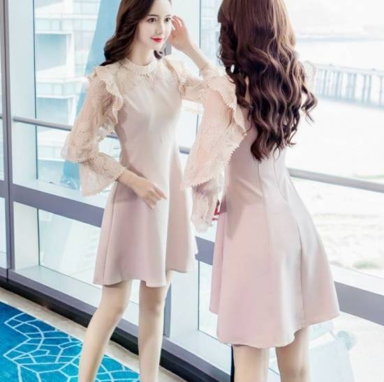 オフショルワンピースに重ねたシースルーレースが可愛いらしいショートフレアワンピース。