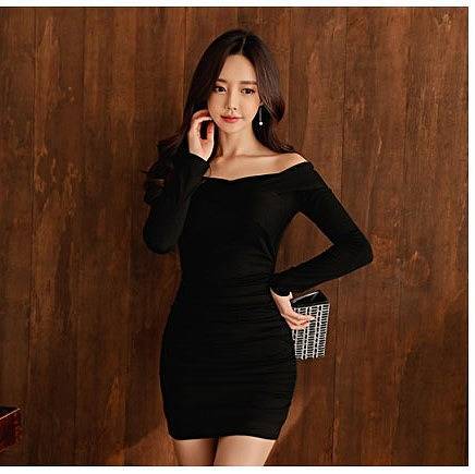 ざっくりとあいたデコルテがセクシーなオフショルダーワンピ。
