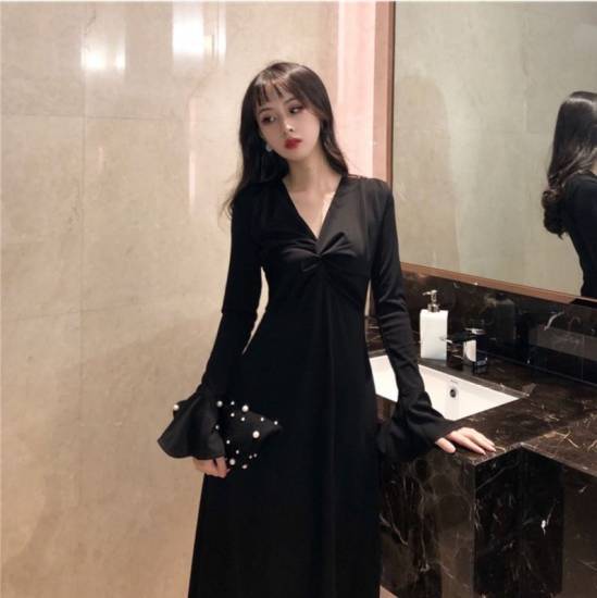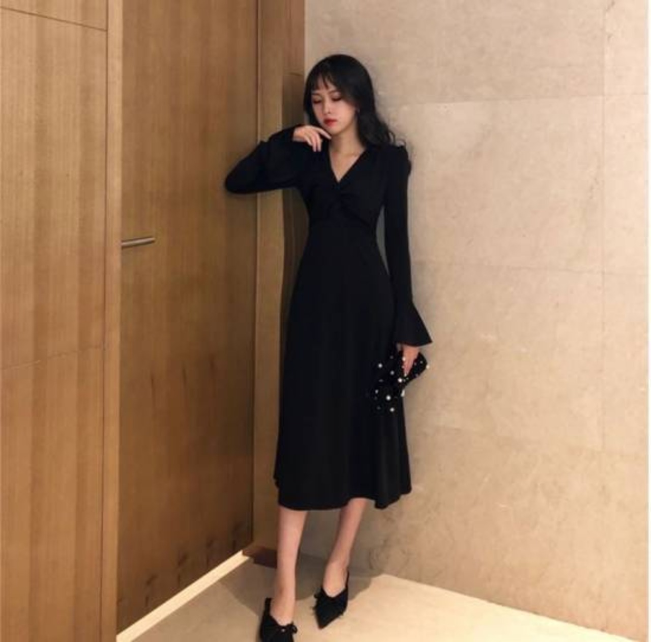 深めのVネックで大人っぽさを強調したシンプルなワンピース。