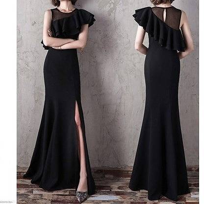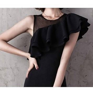 肩からバストにあしらったボリュームのあるフリルがゴージャスなブラックドレスです。