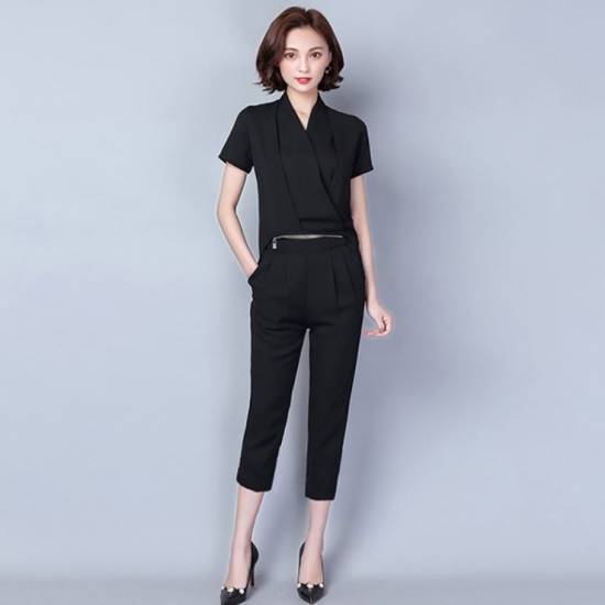 カシュクールVネックの半袖とクロップドパンツのセットアップ。