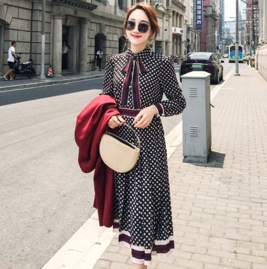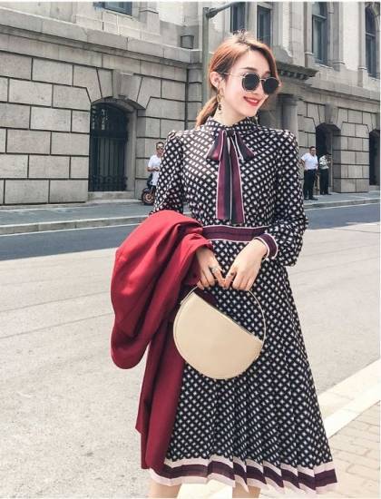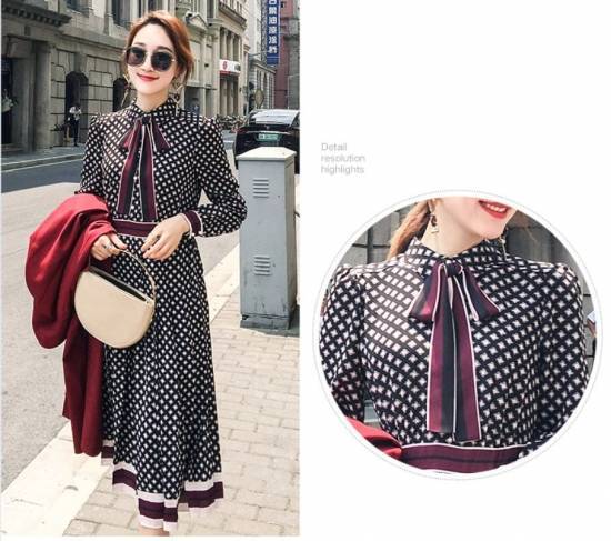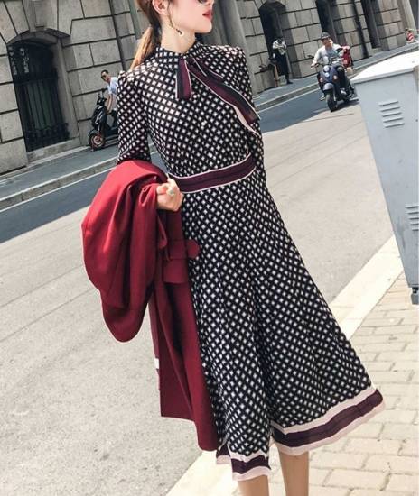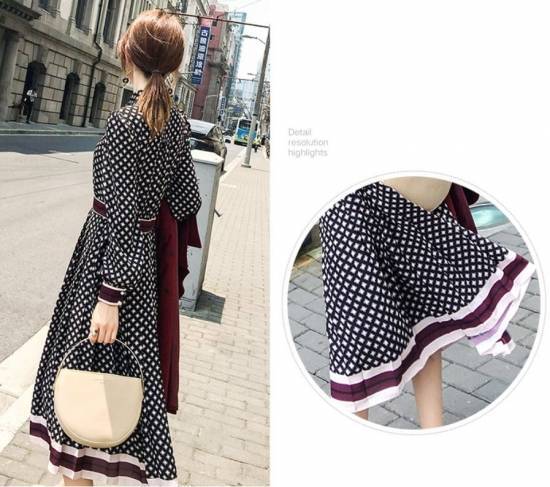 リボンタイ風のネックデザインがキュートなミモレ丈のワンピース。