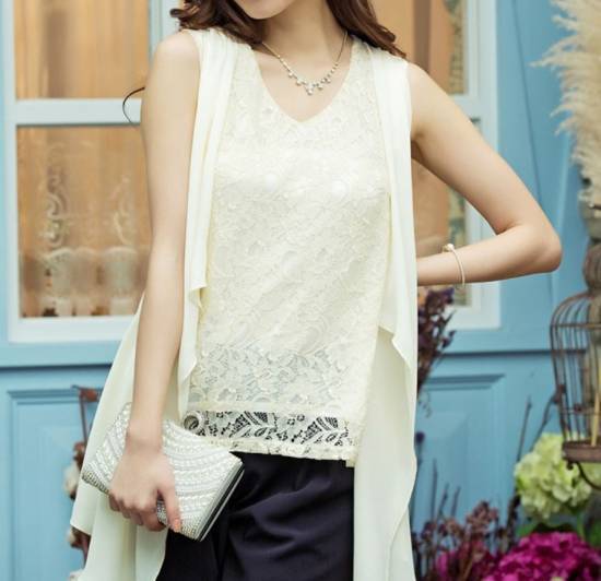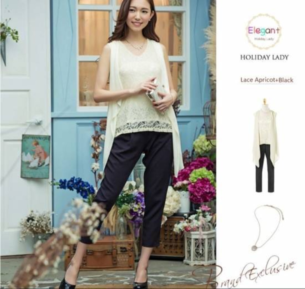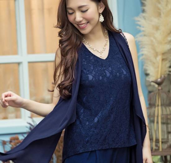 高級レース素材トップス×シフォンパンツの2ピースの組み合わせで、コーデを楽しめます。