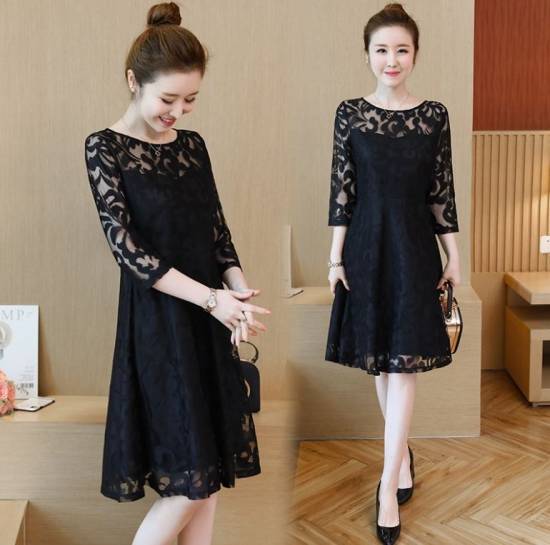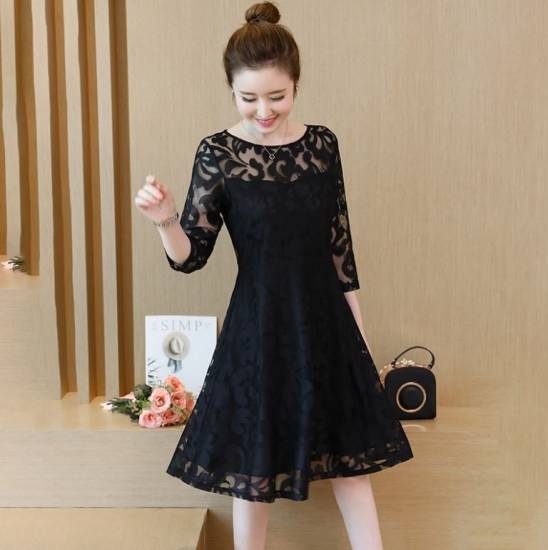 シンプルなミディアム丈のカクテルドレスはレースデザインが特徴