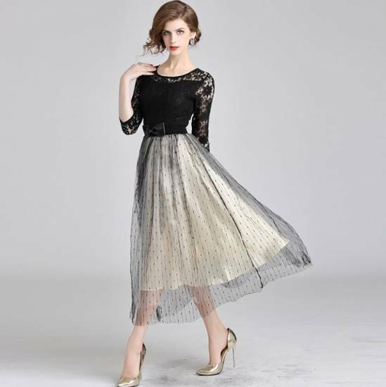 5)お客様の個人情報は発送以外に使用することは一切ございません。ご安心して、ご利用ください。透け感のあるレース使いが華やかなロングドレスです。
