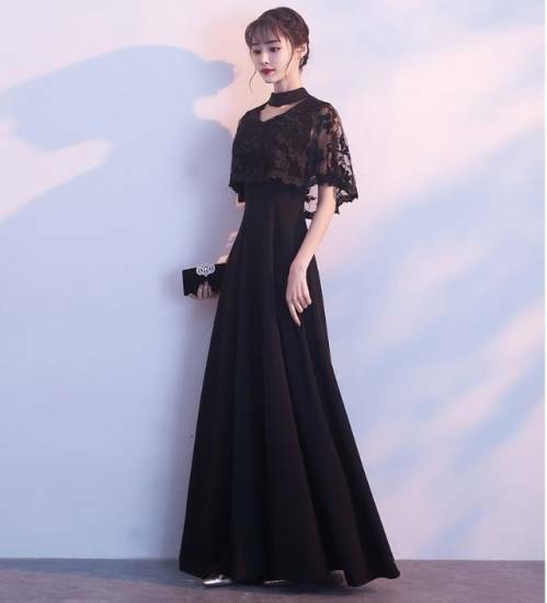 5)お客様の個人情報は発送以外に使用することは一切ございません。ご安心して、ご利用ください。フルレングスのブラックレースドレス。