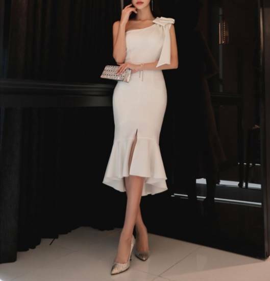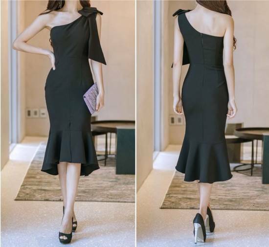 5)お客様の個人情報は発送以外に使用することは一切ございません。ご安心して、ご利用ください。アシメオフショルダーとタイトなラインが大人っぽい印象のミディ丈ワンピース。