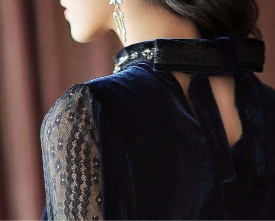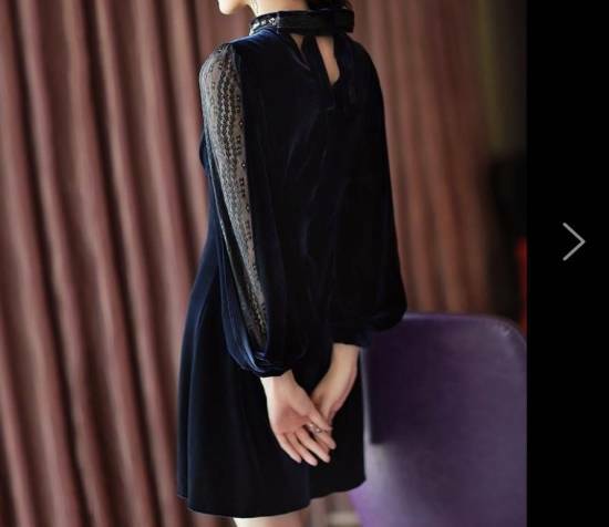 袖のシースルーとハイネックの輝く装飾がキュートなAラインフレアのワンピース。
