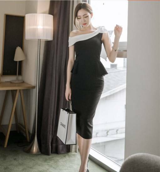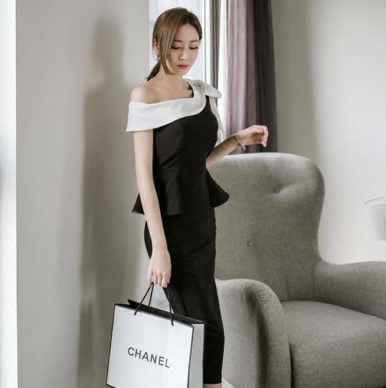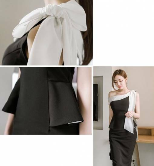 バイカラーの大胆な肩魅せがセクシーな印象の膝丈ワンピース。