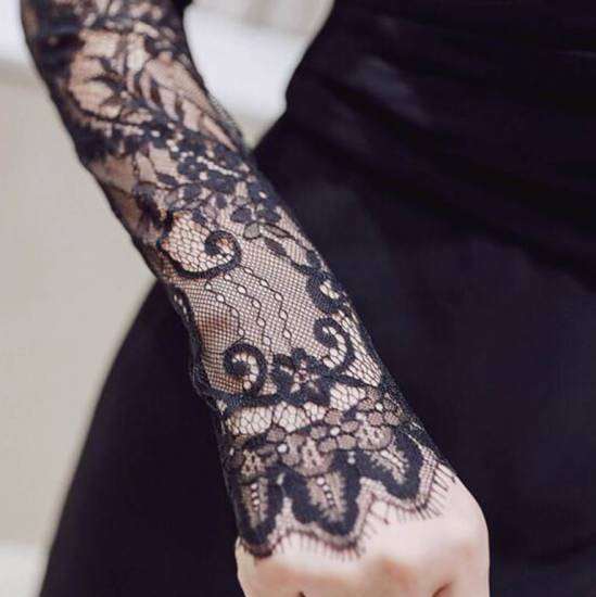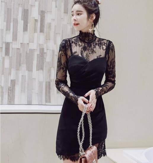 透かしレースがトップスに使用された贅沢なブラックワンピース。