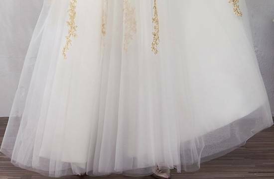 Aラインのボートネックがエレガントなウエディングドレスです。