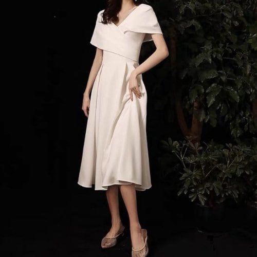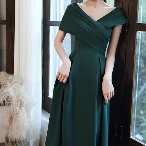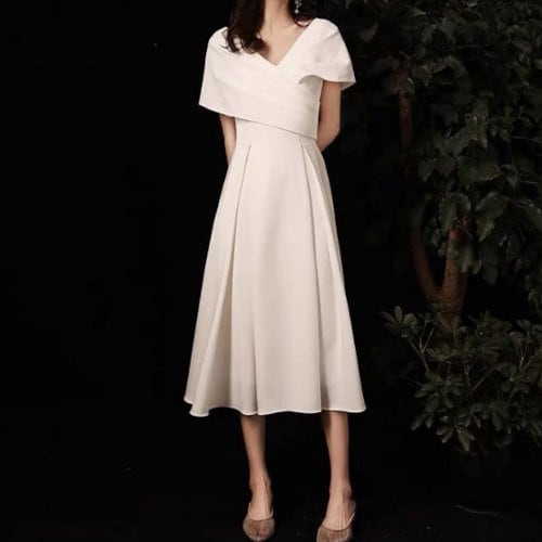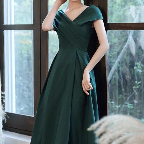大きく開いたVネックが目を引くミモレ丈フレアドレス。