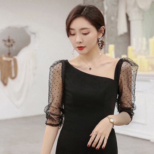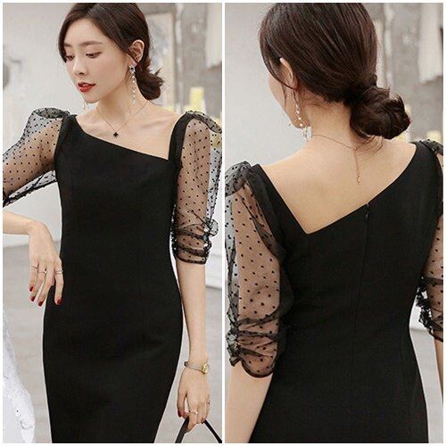 パーティードレス お呼ばれ パーティー 二次会 結婚式 ミモレ丈 黒 シースルー ドット柄 アシンメトリー 大人かわいい エレガント パーティードレス お呼ばれ パーティー 二次会 結婚式 ミモレ丈