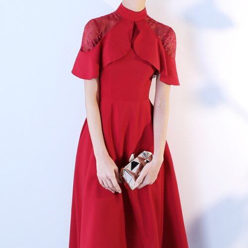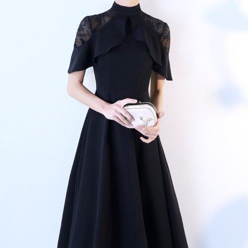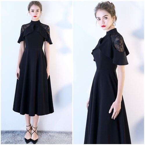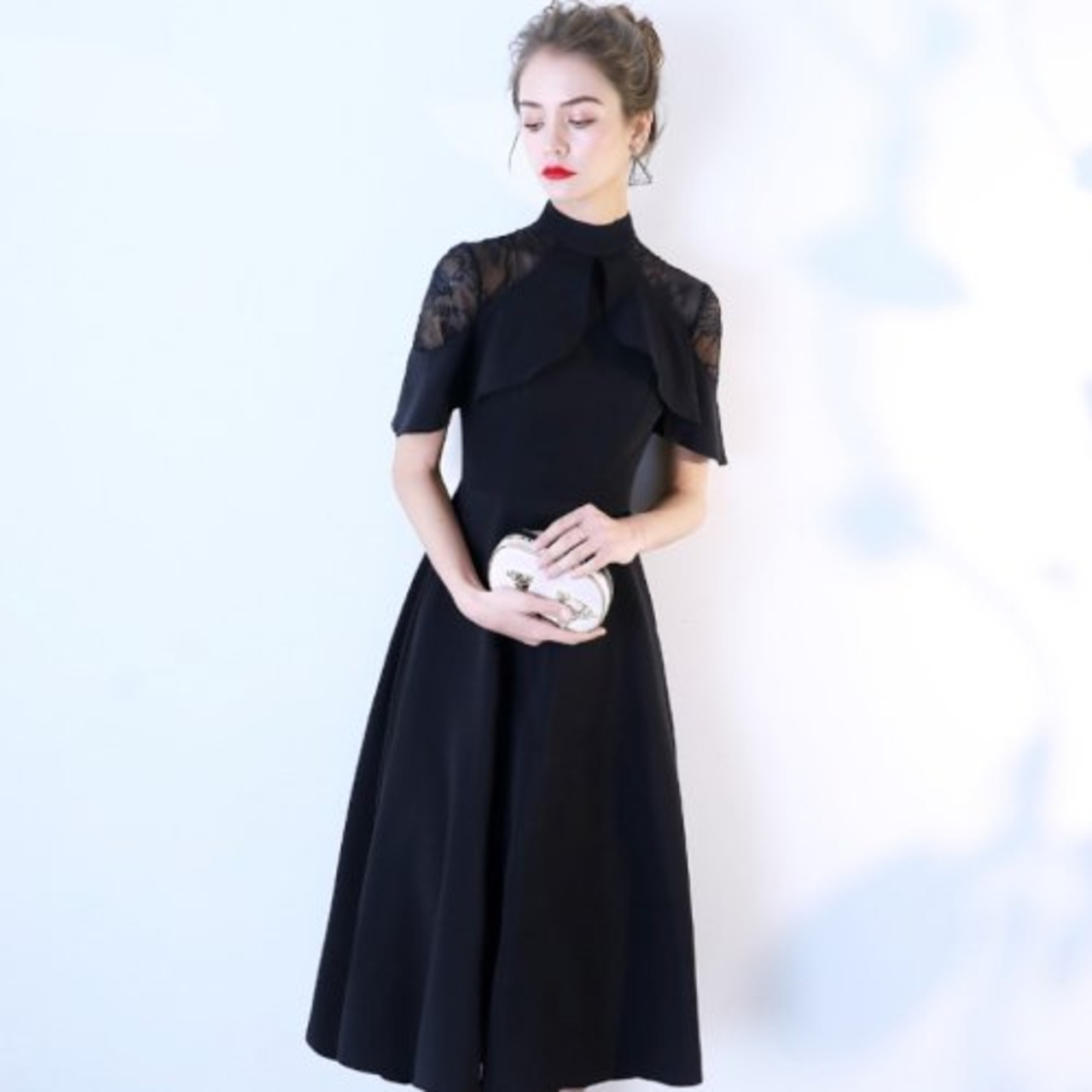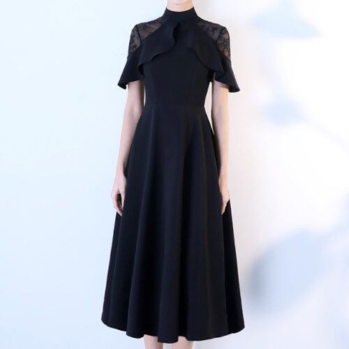 パーティードレス 結婚式 二次会 発表会 演奏会 パーティー 半袖 ミモレ丈 レース 黒 Aライン フレア 大きいサイズ エレガント パーティードレス 結婚式 二次会 発表会 演奏会 パーティー 半袖