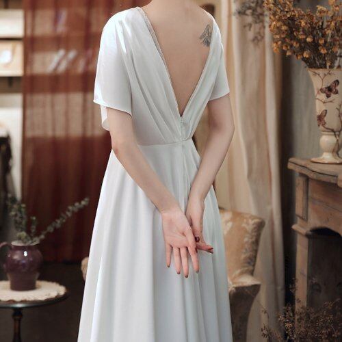 パーティードレス イブニングドレス 結婚式 パーティー 白 半袖 Vネック ロングドレス バックシャン フレア マキシ丈 ブライダル パーティードレス イブニングドレス 結婚式 パーティー 白 半袖