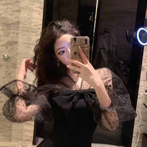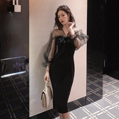 パーティードレス 結婚式 二次会 お呼ばれ パーティー シースルー プチドット柄 リボン ボリューム袖 シフォン ドット柄 タイトドレス フェミニン ミモレ丈 異素材 黒 パーティードレス 結婚式