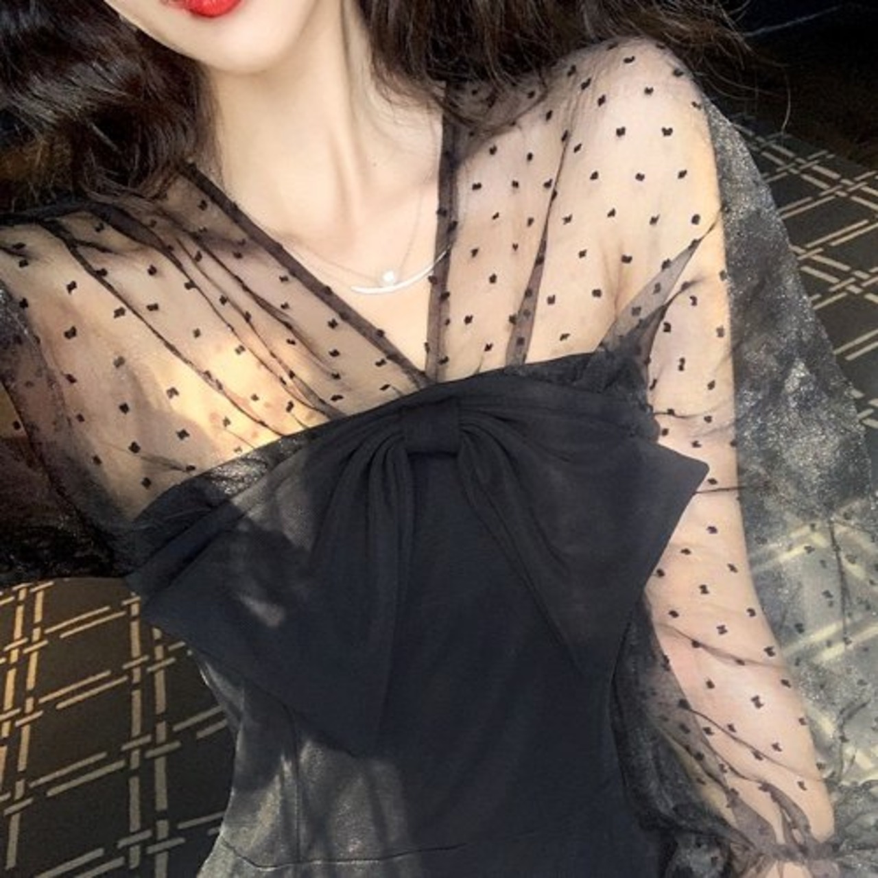 胸元のリボンやシースルーのプチドット柄がかわいいデザイン。