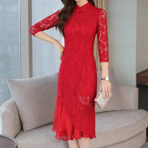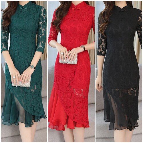 パーティードレス 結婚式 二次会 発表会 演奏会 パーティー お呼ばれ チャイナカラー レース シフォン ミモレ丈 ワンピース 黒 七分袖 大きいサイズ パーティードレス 結婚式 二次会 発表会