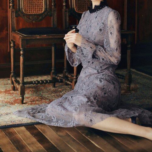 透け感のあるフラワー刺繍がエレガントなミモレ丈ドレス。