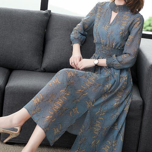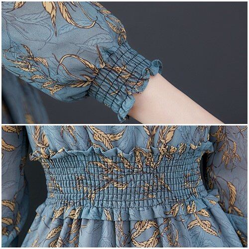 パーティードレス 結婚式 二次会 パーティー 同窓会 謝恩会 ミモレ丈 ワンピース ウエストマーク シフォン 七分袖 リーフ柄 20代 30代 40代 パーティードレス 結婚式 二次会 パーティー