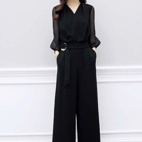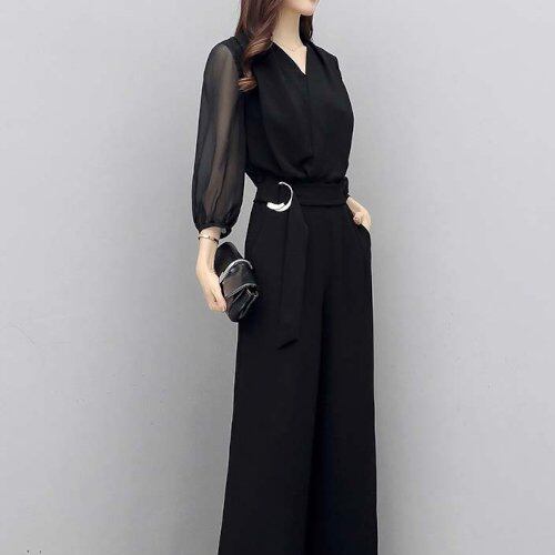 パンツドレス 結婚式 二次会 発表会 入学式 同窓会 お呼ばれ シースルー 七分袖 黒 ワイドパンツ カシュクール Vネック シフォン 大きいサイズ パンツドレス 結婚式 二次会 発表会 入学式