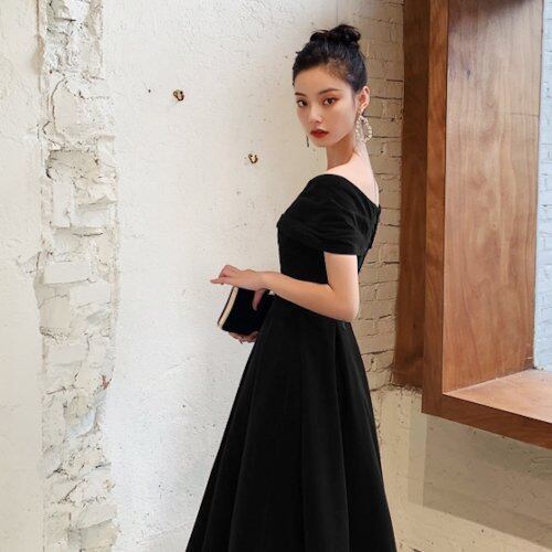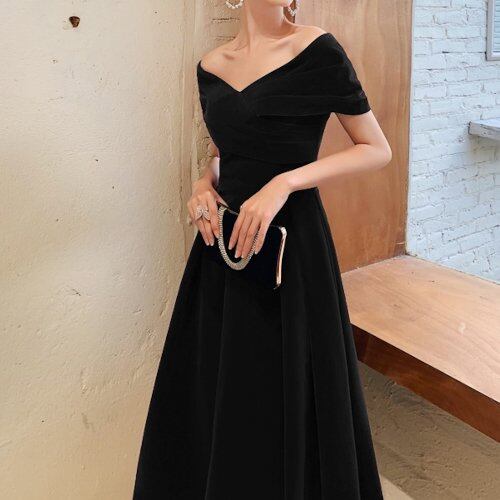 パーティードレス イブニングドレス 結婚式 二次会 パーティー 発表会 演奏会 お呼ばれ マキシ丈 黒 オフショルダー シンプル エレガント 肩見せ 大きいサイズ フレアドレス パーティードレス
