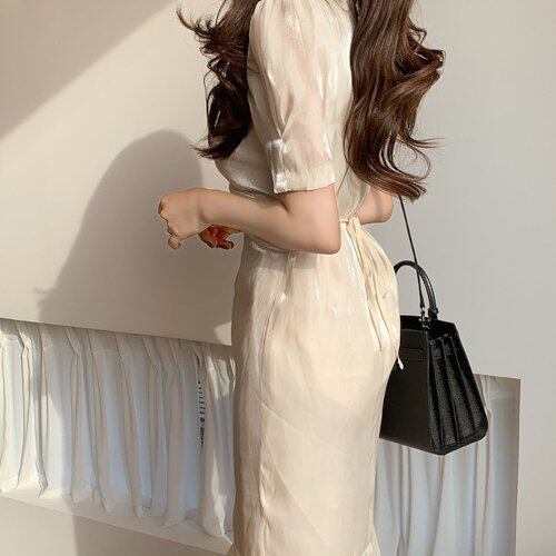 光沢のある素材感が華やかな印象のミモレ丈ワンピース。