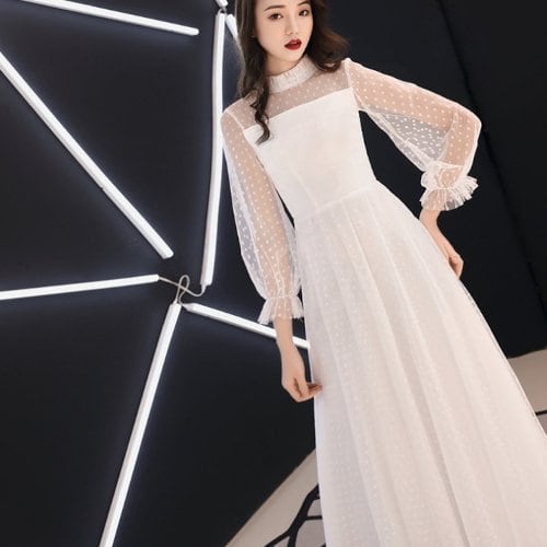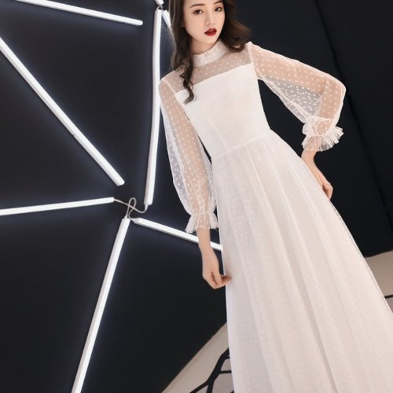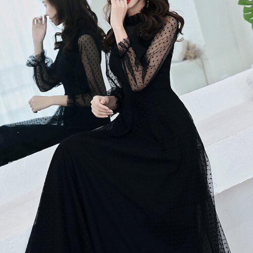 パーティードレス 結婚式 二次会 発表会 演奏会 お呼ばれ パーティー マキシ丈 黒 シースルー 七分袖 ドット柄 シフォン チュール フリル 大きいサイズ パーティードレス 結婚式 二次会 発表会