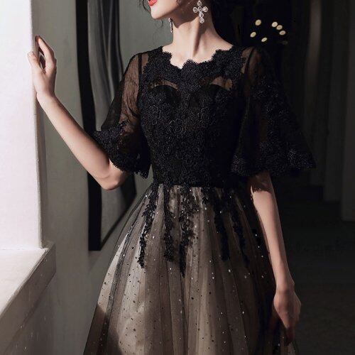 パーティードレス 結婚式 二次会 お呼ばれ 発表会 演奏会 パーティー 半袖 シースルー レースアップ スパンコール 刺繍 レースアップ ツートン バイカラー ミモレ丈 大きいサイズ パーティードレス