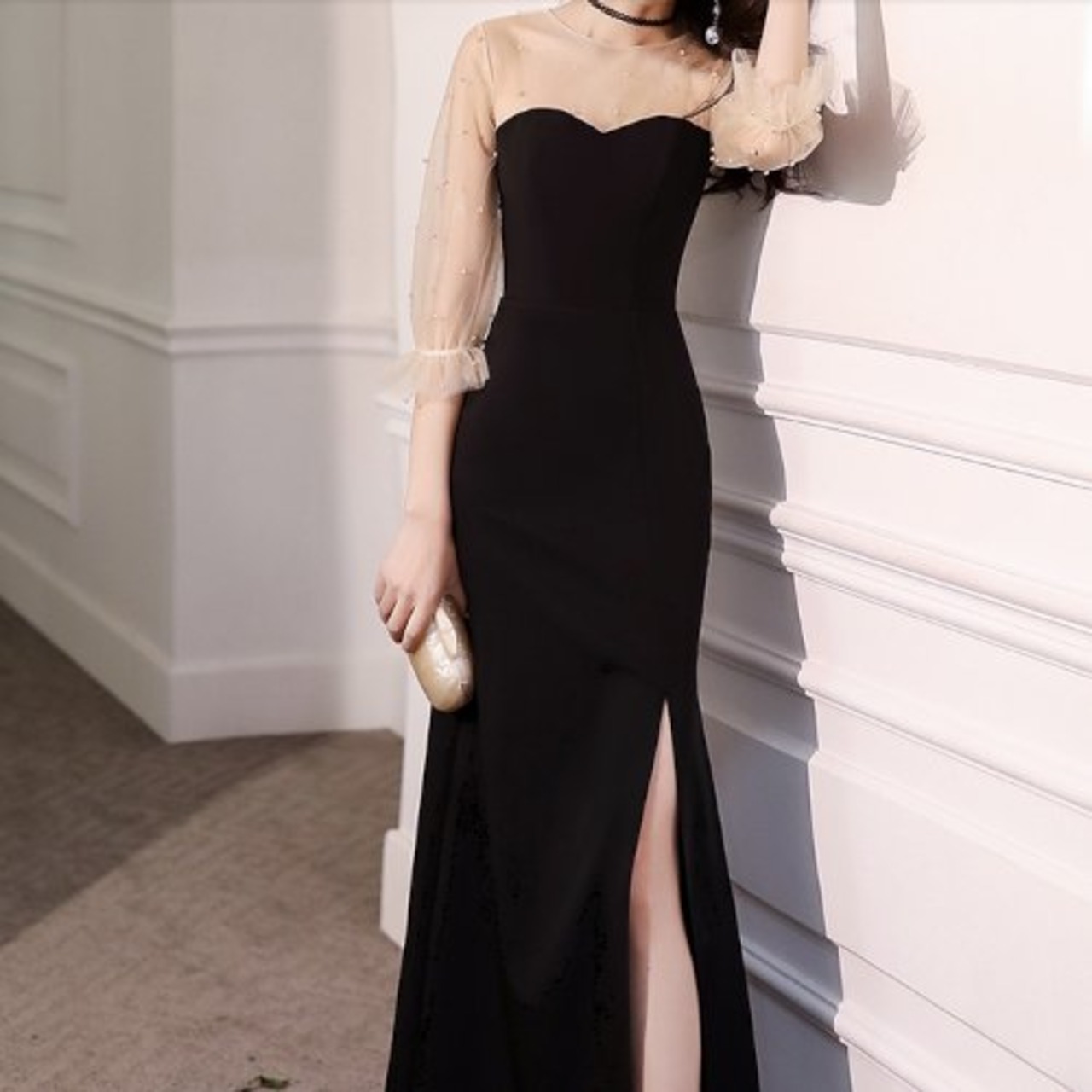 パーティードレス 結婚式 二次会 発表会 お呼ばれ パーティー ロング丈 黒 スリット シースルー パール エレガント 七分袖 パーティードレス 結婚式 二次会 発表会 お呼ばれ パーティー ロング丈