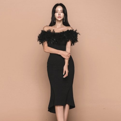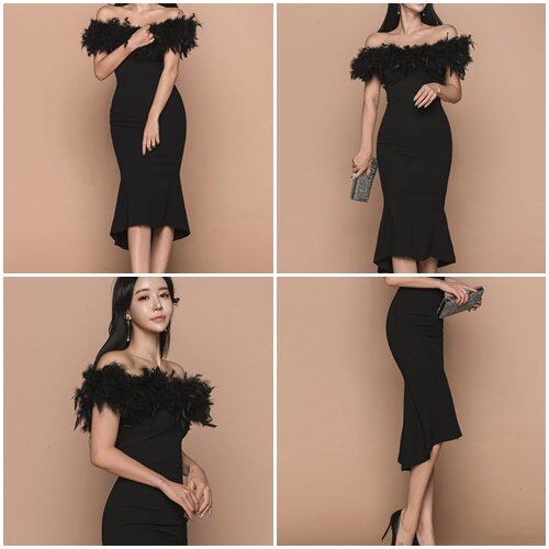 パーティードレス 結婚式 二次会 発表会 お呼ばれ パーティー ワンピース 黒 白 マーメイド ファー オフショルダー 大きいサイズ タイトドレス パーティードレス 結婚式 二次会 発表会 お呼ばれ