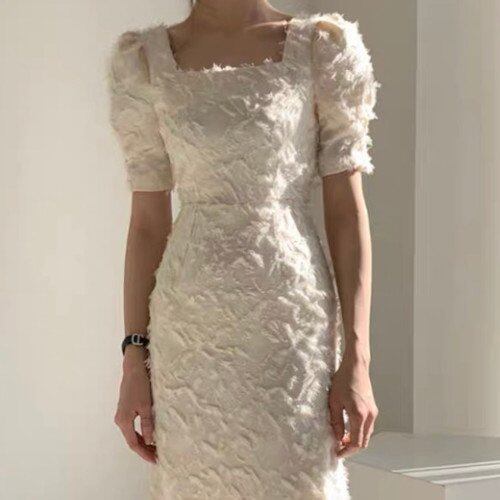 ふわふわした生地が大人かわいいミドル丈ワンピース。