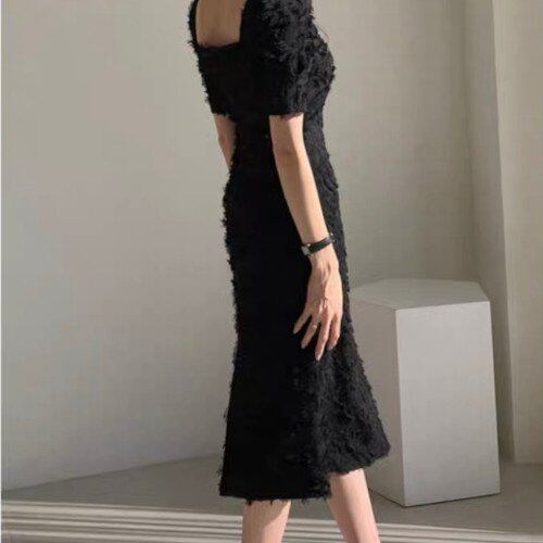 パーティードレス 結婚式 二次会 お呼ばれ 発表会 パーティー ミドル丈 ワンピース 黒 ジャガードスクエアネック 半袖 タイト バックシャン パーティードレス 結婚式 二次会 お呼ばれ 発表会